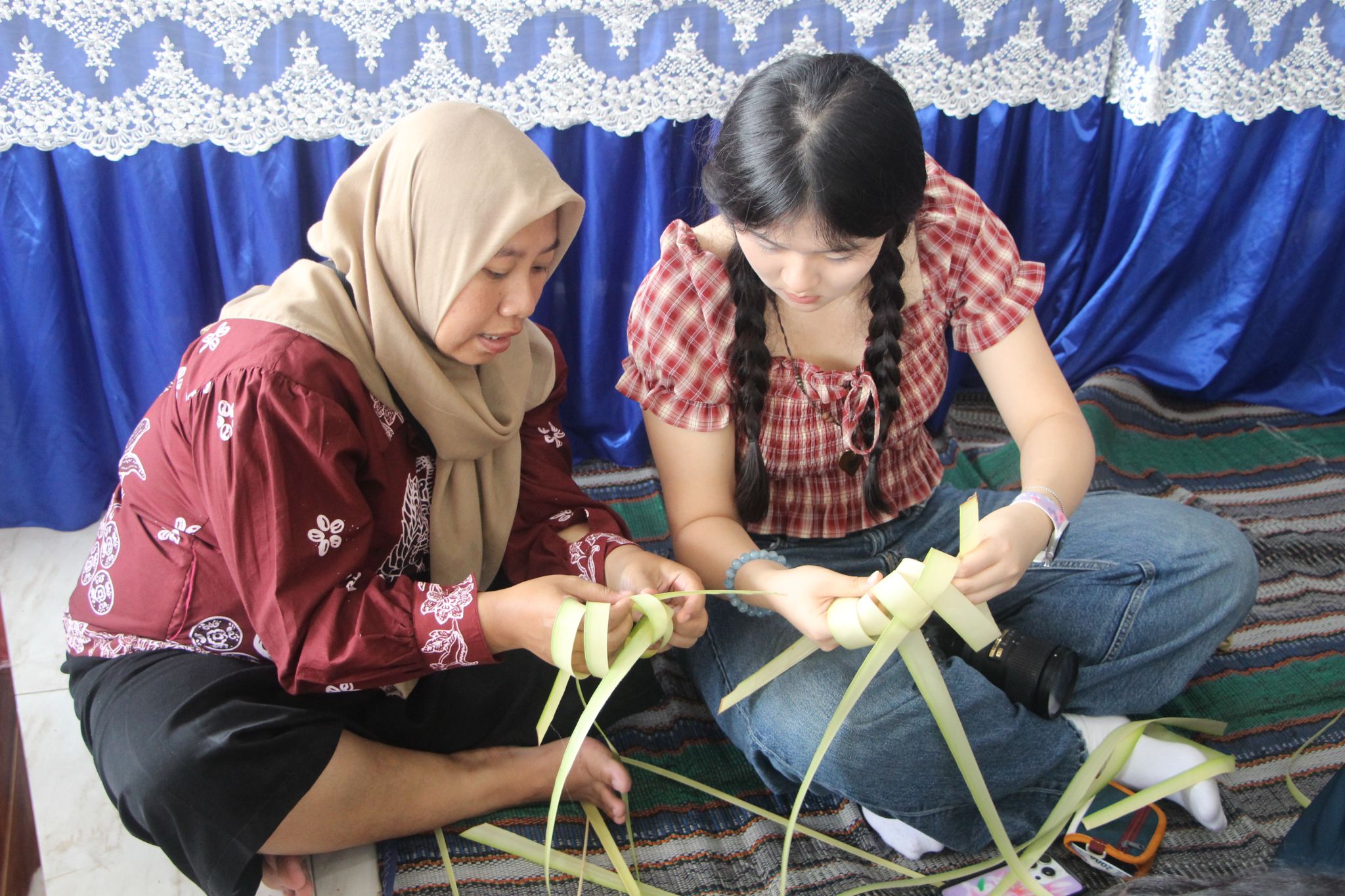 团队深入乡村产业一线,走访传统吉庞(Jipang,一种特色米糖)家庭作坊,走进咖啡豆种植园与加工工坊了解咖啡豆从种植、加工到销售的全产业链运作,体验印尼粽(Ketupat)编织技艺,学习制作爪哇文化象征之一的巴朗孔(Blangkon)男性帽子,从日常细节中理解当地生活美学。