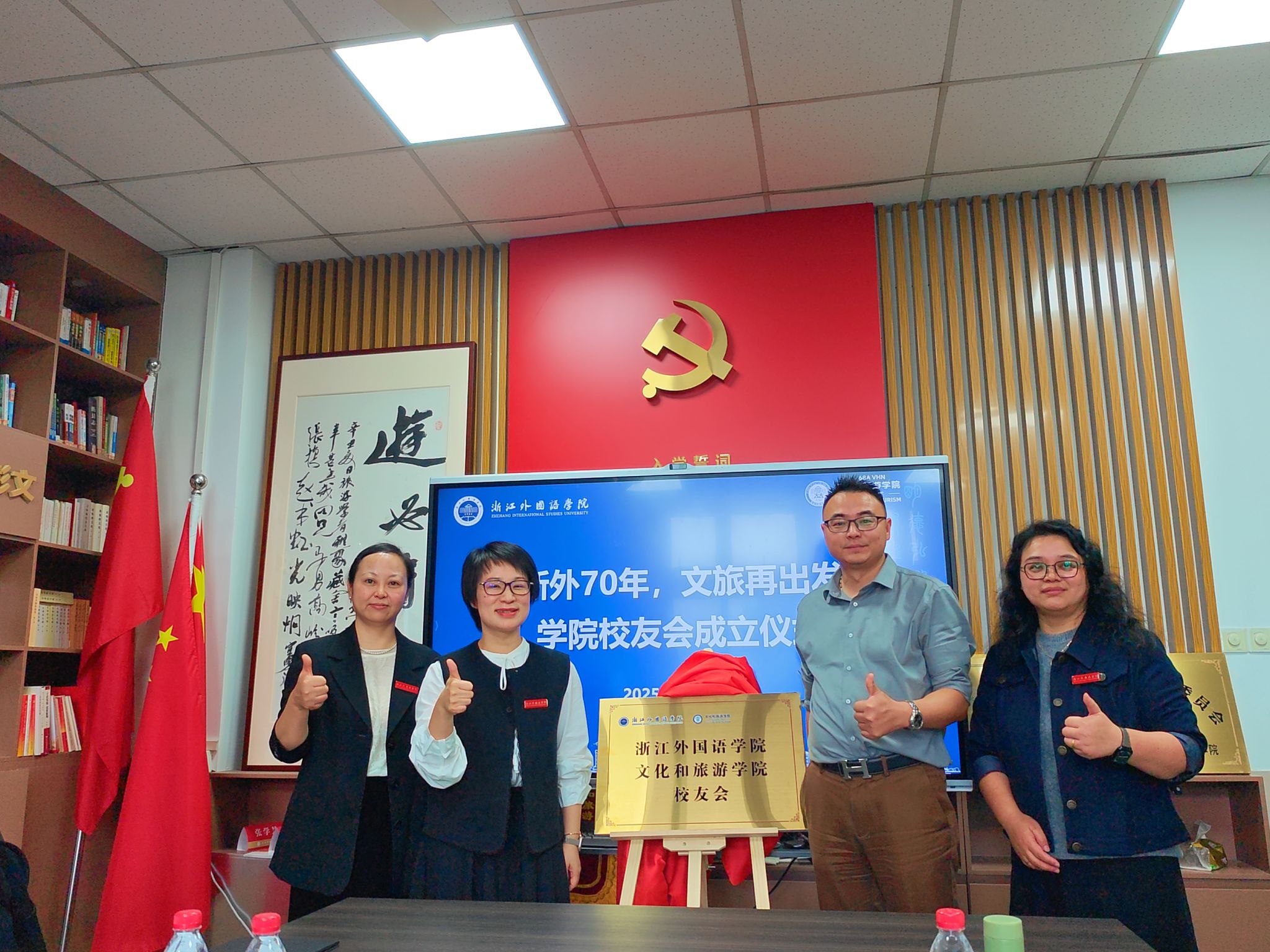现场选举产生第一届校友会会长、副会长、秘书长、副秘书长、常务理事和理事等成员,将以《浙江外国语学院文化和旅游学院校友会章程》为纲领,携手文旅校友凝聚智慧、整合资源,共同擘画母校与校友事业同频共振、蓬勃发展的美好蓝图。范芸芸向学院校友会会长何志能授旗,葛青青、范芸芸、黄瑾与何志能携手为校友会揭牌,为学院校友工作翻开了崭新的一页。
