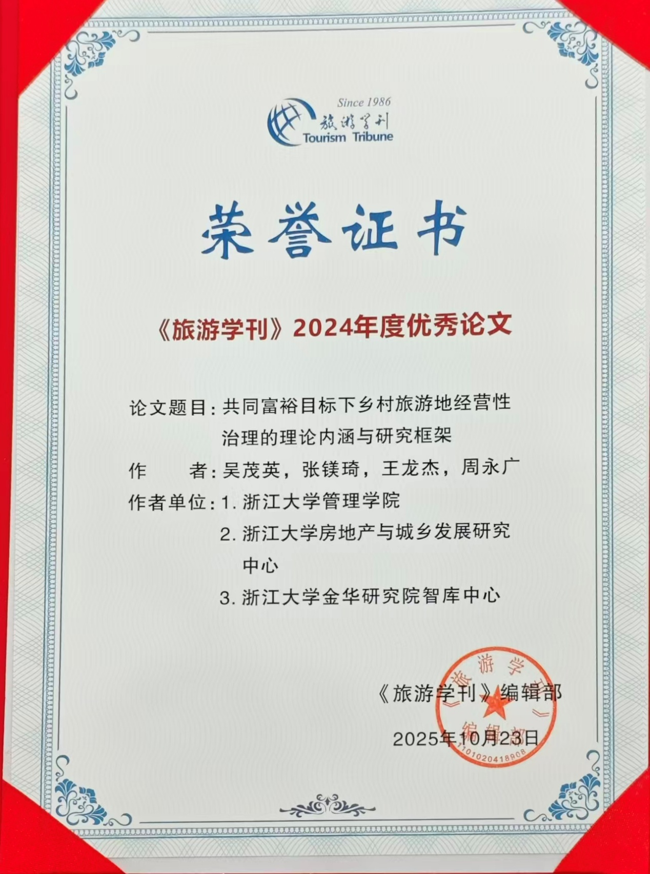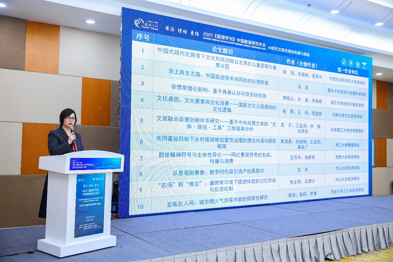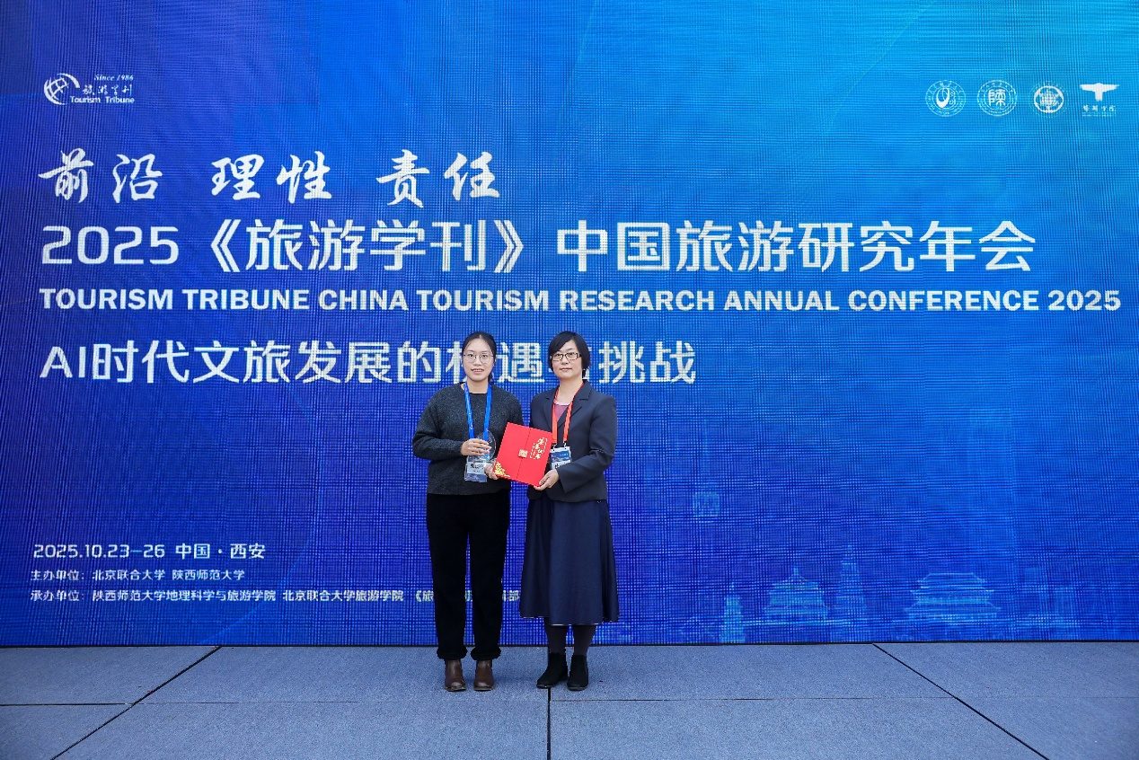 “促进共同富裕,最艰巨最繁重的任务仍然在农村”。2025年10月23日,我院青年教师王龙杰合作撰写的《共同富裕目标下乡村旅游地经营性治理的理论内涵与研究框架》一文,荣获《旅游学刊》2024年度优秀论文。《旅游学刊》副主编、北京联合大学旅游学院孙业红教授于学刊年会上为论文颁奖。